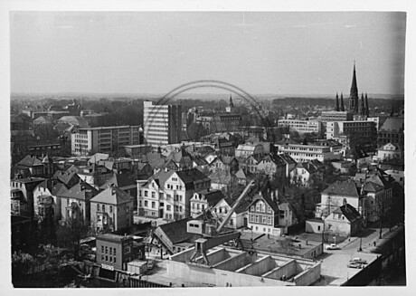 Aufnahme vom Silo der Fa. J. Müller. Im Vordergrund die Nikolausstraße mit dem Umschlagsplatz der Hafenspedition Midgard.