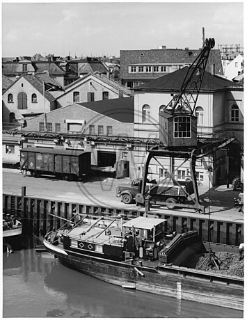 Entladen eines Frachtschiffs im Oldenburger Hafen. Im Hintergrund rechts das Städtische Hafenamt. Auftragsarbeit für Fa. Roelofs & Co GmbH - Foto Lenze