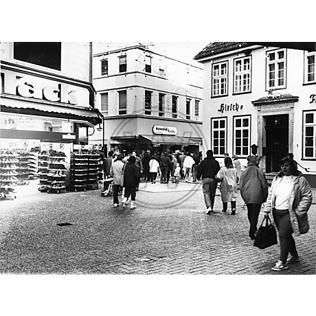 Abgebildet sind Personen beim Bummeln in der Oldenburger Innenstadt vor einem Schuhgeschäft und der Hirsch Apotheke