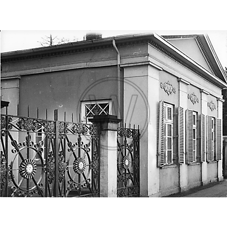 Abgebildet ist ein historisches Gebäude neben dem Eingang zum Schlossgarten an der Gartenstraße