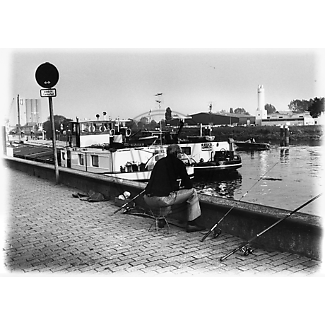 Angeln, Fische, Fluss, Fotografie, Hafen, Industrie, Kanal, Rosemeyer, Schiffe, schwarz-weiß, Segelschiffe, Straßenschild