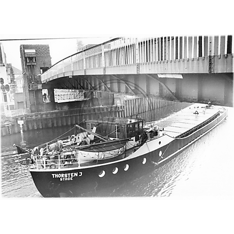 Abgebildet ist das Schiff "Thorsten J" aus Stade unter der gehobenen Cäcilienbrücke