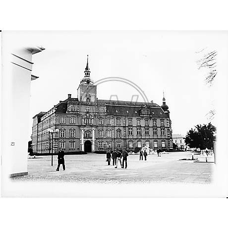 Abgebildet ist das Oldenburger Schloss und Personen die auf dem Schlossplatz spazieren