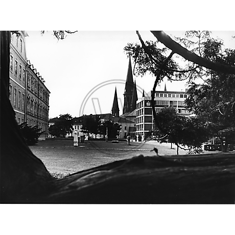 Abgebildet ist der Schlossplatz in der Oldenburger Innenstadt mit Lamberti-Kirche und LzO Filiale