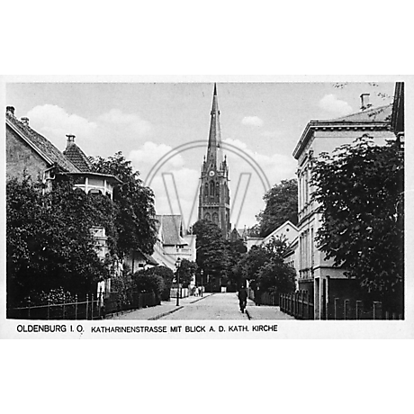 Abgebildet ist eine Postkarte mit Aufschrift: "Oldenburg I. O. Katharinenstrasse mit Blick auf die kath. Kirche"